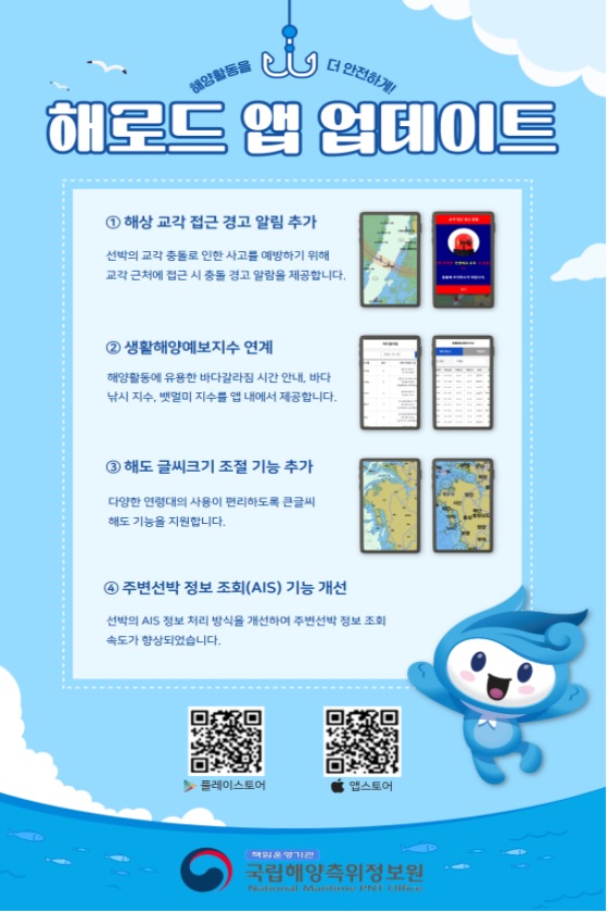 이번에 새로 △해상교각 접근 알람 △생활해양예보지수 연계 △해도 글자 크기 조절 기능 등 해로드 이용자 의견수렴 등을 통해 수요자가 필요로 하는 기능을 추가했다.