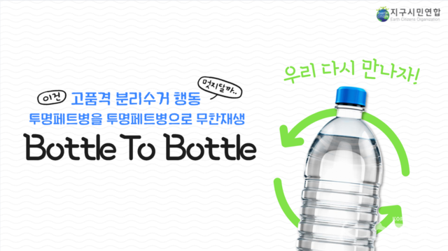지구시민연합은 오는 4월 22일 '지구의 날'을 기념하여 '고품격 분리수거 Bottle to Bottle (이하 보틀투보틀)’ 캠페인을 전국 22개 지부에서 동시에 진행할 계획이다.