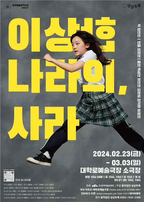 한국문화예술위원회의 2023 ‘공연예술창작산실’ 연극 부문 올해의 신작에 선정된 창작집단 상상두목의 연극 <이상한 나라의, 사라>(작 원인진, 연출 최치언)이 오는 2월 23일부터 3월 3일까지 서울 종로구 대학로예술극장 소극장에서 관객과 만날 예정이다.