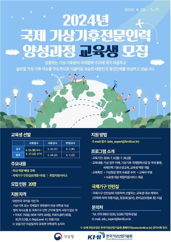 기상청은 올해에도 국제 기상기후 전문인력을 양성하기 위해 교육생을 모집하며, 대한민국 국적으로 관련 전공 및 어학 요건을 갖춘 대학 재학생 이상이면 지원할 수 있다. 특히 올해는 사업의 내실화를 위해 교육 인원을 20명으로 조정하고, 기상기후 분야 국제협력에 필요한 국제적 실무능력을 집중적으로 훈련한다.