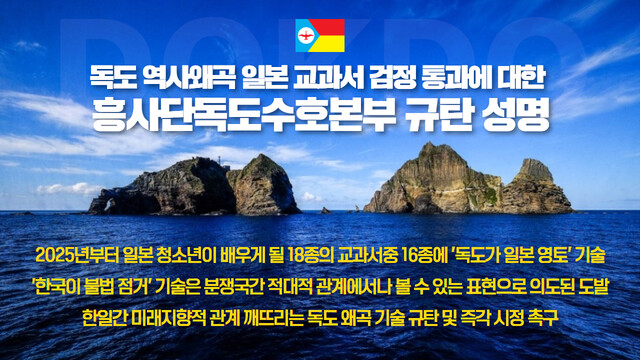 성명서에서 “일본 정부가 2025년부터 일본 중학생들이 사용하게 될 교과서에 ‘독도는 일본 고유의 영토', '독도를 한국이 불법 점거했다'고 기술한 것으로 알려졌다. 지리 교과서를 위시해 역사, 공민(사회) 교과서에 걸쳐 전체 18종의 교과서중 83%가 넘는 15종이 한국 불법 점거 억지 주장을 대놓고 적고 있다.”며 노골화 되고 있다고 비판했다.