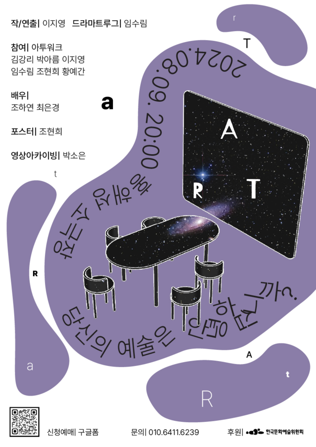 한국문화예술위원회 ‘2024 창작의과정 연극 선정작’ 〈당신의 예술은 안녕하십니까?〉(작·연출 이지영)는 예술노동을 여러 각도로 조망해 온 단체인 ‘아투워크(artowork)’가 그동안 고민해 왔던 것을 전시와 모큐멘터리대본 발표 형식으로 선보이는 쇼케이스이다.