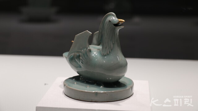 전시관 한 켠, 연꽃 위에 앉아있는 귀룡(거북의 몸, 용의 머리를 한 상상의 동물)모양의 주자 두 작품이 마주하고 있다. 두 청자가 흡사해 보이나 한 마리는 고개를 들고 입을 벌려 포효하는 듯하고, 또 다른 한 마리는 새 부리와 같은 주둥이를 내밀고 있다. 눈과 손잡이에는 철 안료로 점을 찍어 생동감을 더했다.