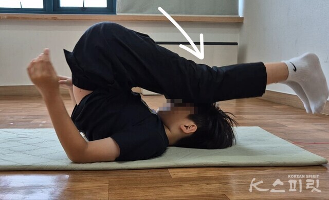 어깨가 뒤로 넘어가고 힘이 많이 들어갔다. 누웠을 때 발의 각도가 많이 벌어지는데 발의 각도로 단전과 고관절의 상태를 파악할 수 있다.
