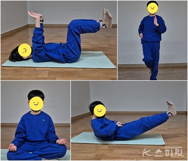 초기 찬영이 자세는 배가 들어가고 어깨는 올라가서 앉아 있을 때면 등이 구부정하게 굽었고 좌우 균형이 틀어져 어깨높이가 달랐습니다. 특히, 오금(무릎 뒤쪽)이 펴지지 않아 다리를 쭉 뻗지 못했습니다. 찬영이는 수업을 하면서 구부정한 자신의 자세를 처음으로 인지하게 되었습니다. 바른 자세를 인지하는 것부터 ‘나에 대한 이해’가 시작되는 것이죠.