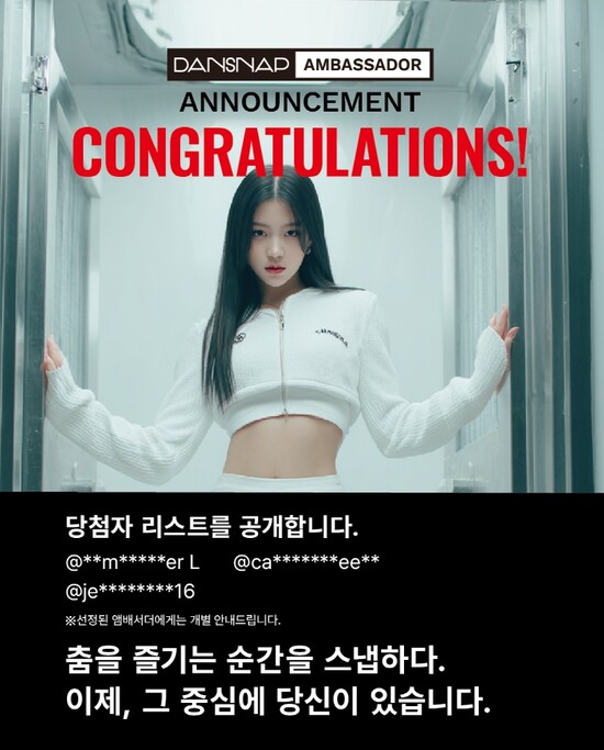 댄스냅 앰배서더는 향후 서울 용산 아이파크몰에 마련된 팝업스토어를 중심으로, 영상 콘텐츠 제작, SNS 홍보, 브랜드 협업 콘텐츠 등 다양한 활동에 참여하게 된다. 아울러 콘텐츠 제작 지원금, 헤어·메이크업 제공 등 브랜드 전폭 지원 혜택도 함께 제공된다.