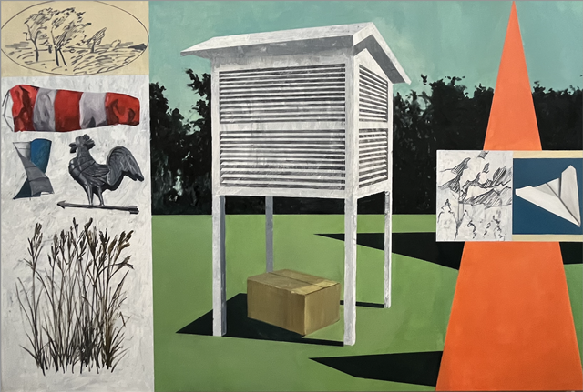 전시에서 선보이는 주요 작품 중 하나인 '바람의 방향'(2024) 은 바람이라는 비가시적 자연 현상을 기호화한 대형 회화로, 바람개비, 풍향계, 종이비행기 등 다양한 시각적 상징이 화면에 정교하게 배치되어 있다. 관람객은 이 이미지들을 따라가며 자연과 인간, 보이는 것과 보이지 않는 것의 경계를 사유하게 된다.
