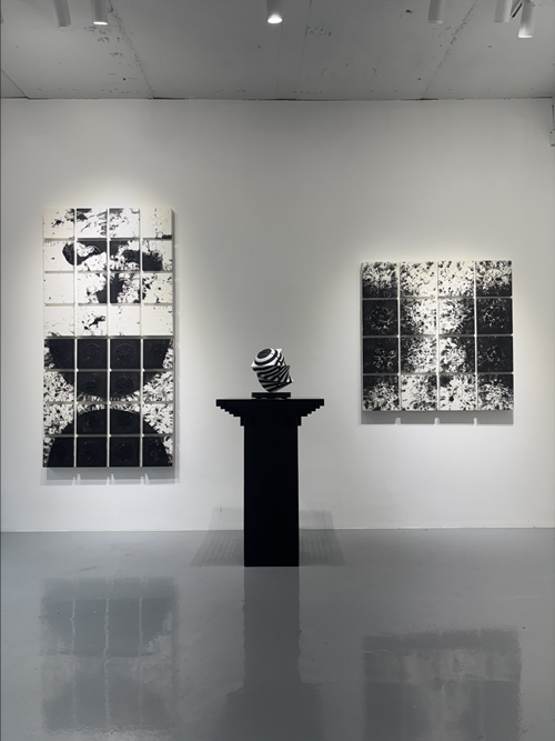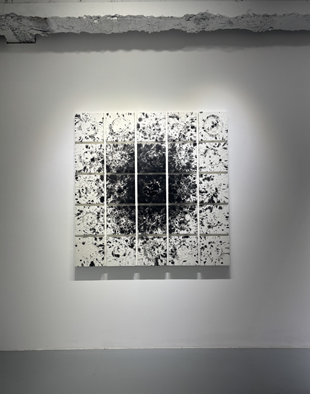 한편 박동수는 베르사이유와 서울을 오가며 전혀 다른 추상을 탐구해 왔다. 그의 <시공 추상>연작에서 우리가 마주하는 것은 시간의 물질화이다. 사각형의 프레임이 모여진 형태의 작품 안에 각각 다르게 분포된 먹의 흔적들은 우주의 형성 과정을 암시하며, 원형의 궤적과 사각형의 틀이 만들어내는 리듬 안에는 작가가 20년간 축적해 온 시간에 대한 사유가 직조되어 있다.