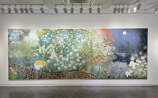 이번 전시의 하이라이트는 3년에 걸쳐 완성한 대작 <JARDIN>이다. 임지영 작가는 코로나19 팬데믹으로 세상이 멈춰선 그때 중국에서 한국으로 돌아왔다. 그 3년의 ‘빈들’과 같았던 시기에 바로 이 작품이 <JARDIN(쟈뎅)>이 탄생했다. JARDIN(쟈뎅)은 ‘정원’을 뜻하는 불어로 모든 것을 상상하고 꿈꿀 수 있는 낙원, 상상 속에서 존재하는 미지의 세계를 의미한다. 총 15개의 패널로 이루어진 이 작품은 580×210cm에 달하는 웅장한 규모로 관객을 압도한다. 조선 시대의 ‘일월오봉도’에서 영감을 받아 낮과 밤의 풍경을 한 화면에 담아낸 이 작품은, 작가가 일상 속 산책길에서 만난 자연의 가장 아름다운 순간들을 예술로 승화한 결과물이다. 아울러 기독미술대전에 소개된 <내어드림> 시리즈도 볼 수 있다.