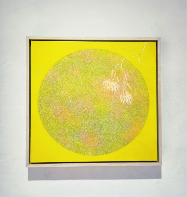 정연경 작가는 <달맞이> 시리즈와 <달의 심장>를 통해 여백과 균형 속에서 달과 열매, 꽃의 고요한 울림을 그려왔다. 작가에게 달은 반복되는 형상이지만 결코 같은 순간이 아니며, 매번 다른 감정과 시간을 품는 매개이다.