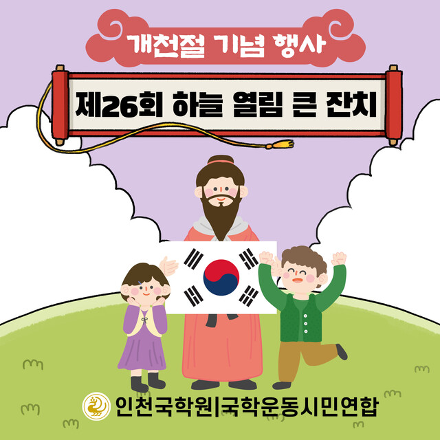 인천국학원(원장 김태은) 주최, 인천국학운동시민연합(대표 김영일)주관으로 10월 3일 오전 10시부터 인천시청 애뜰광장에서 ‘제26회 개천절 기념 하늘 열림 큰잔치’를 개최한다.