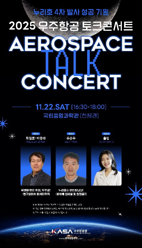 먼저 11월 22일에는 전국 5개 국립과학관에서 토크콘서트를 진행한다. 누리호 4차 발사 전 마지막 주말에 개최되는 이번 토크콘서트에서는 로켓 개발의 역사부터 최신 위성의 개발 과정에 대한 이야기와 이번 누리호 4차 발사를 통해 우주로 발사되는 초소형(큐브)위성 경연대회 수상자의 소감 발표 등 우주개발 전‧현직 연구자와 미래세대가 꿈꾸는 우주항공 이야기를 들을 수 있다.