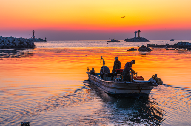 이제 막 태양이 어둠을 밀어내기 시작한 부산광역시 기장군 대변항에서 이른 아침 조업을 나가는 어부들의 일상을 담은 김기홍 작가의 ‘여명 속 출어’가 해양수산부 주최 제7회 국가어항 디지털 사진 공모전에서 대상인 장관상을 수상했다.